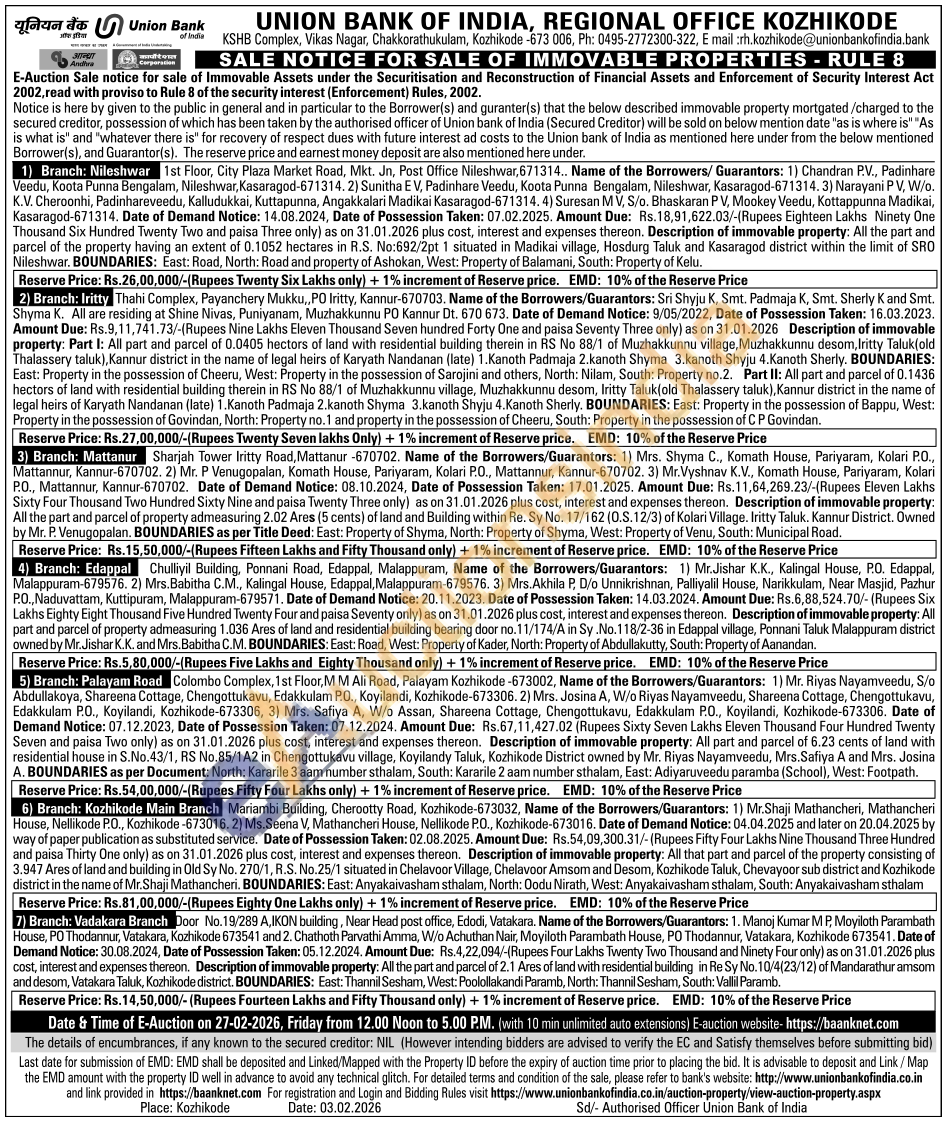 Description of immovable property: All the part and parcel of the property having an extent of 0.1052 hectares in R.S. No:692/2pt 1 situated in Madikai village, Hosdurg Taluk and Kasaragod district within the limit of SRO Nileshwar. BOUNDARIES: East: Road, North: Road and property of Ashokan, West: Property of Balamani, South: Property of Kelu.