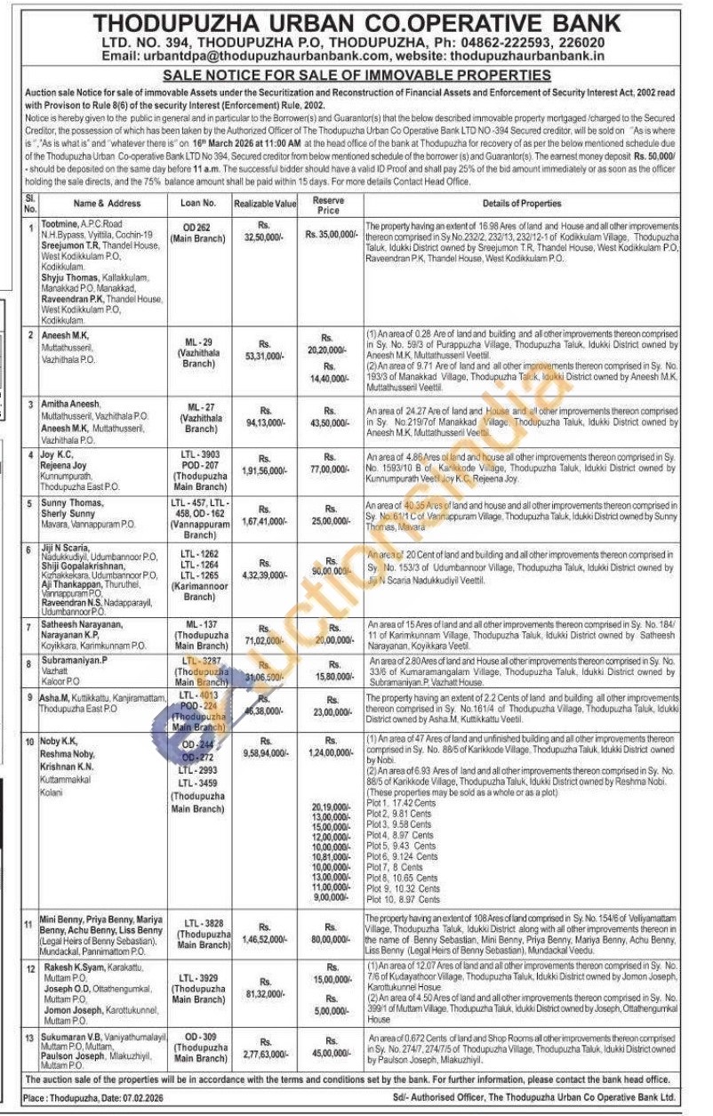 The property having an extent of 16.98 Ares of land and House and all other improvements thereon comprised in Sy. No. 232/2, 232/13, 232/12-1 of Kodikkulam Village, Thodupuzha Taluk, Idukki District owned by Sreejumon T.R, Thandel House, West Kodikkulam P.O. Raveendran P.K, Thandel House, West Kodikkulam P.O.