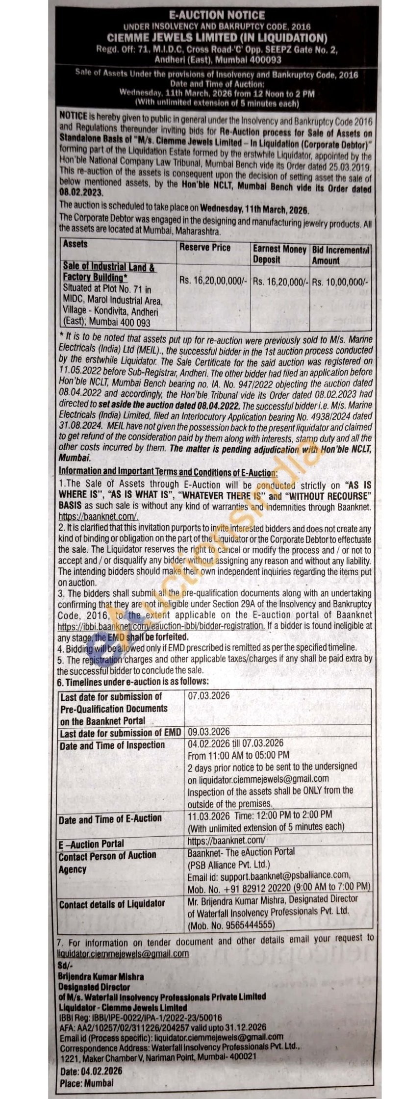 Sale of industrial land & Factory Building Situated at Plot No. 71 in MIDC, Marol Industrial Area Village Kondivita, Andheri (East), Mumbai 400 093