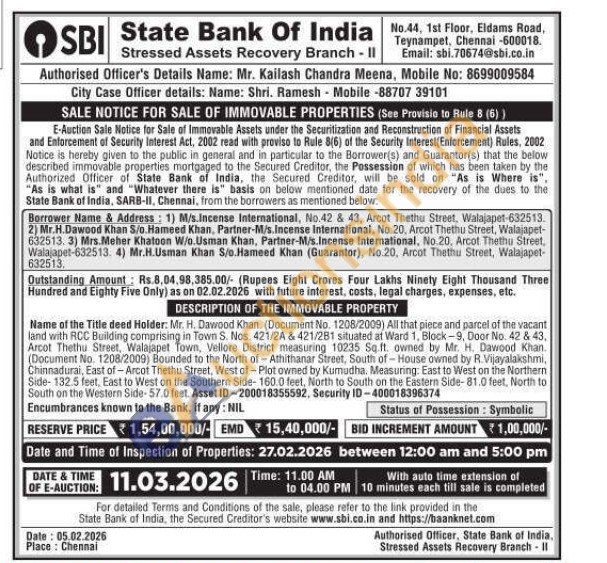 Name of the Title deed Holder: Mr. H. Dawood Khan. (Document No. 1208/2009) All that piece and parcel of the vacant land with RCC Building comprising in Town S. Nos. 421/2A & 421/281 situated at Ward 1, Block-9, Door No. 42 & 43, Arcot Thethu Street, Walajapet Town, Vellore District measuring 10235 Sq.ft. owned by Mr. H. Dawood Khan. (Document No. 1208/2009) Bounded to the North of Athithanar Street, South of House owned by R. Vijayalakshmi, Chinnadurai, East of-Arcot Thethu Street, West of-Plot owned by Kumudha. Measuring: East to West on the Northern Side-132.5 feet, East to West on the Southern Side-160.0 feet, North to South on the Eastern Side-81.0 feet, North to South on the Western Side-57.0 feet. Asset ID-200018355592, Security ID-400018396374