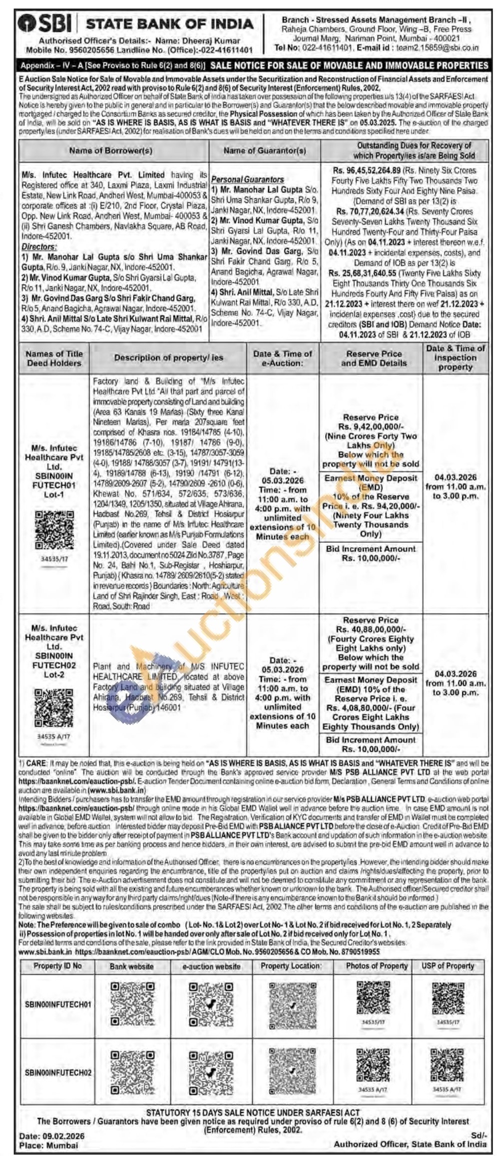 Plant and Machinery of M/S INFUTEC HEALTHCARE LIMITED, located at above Factory Land and building situated at Village Ahirana, Hadbast No.269, Tehsil & District Hoslarpur (Punjab) 146001