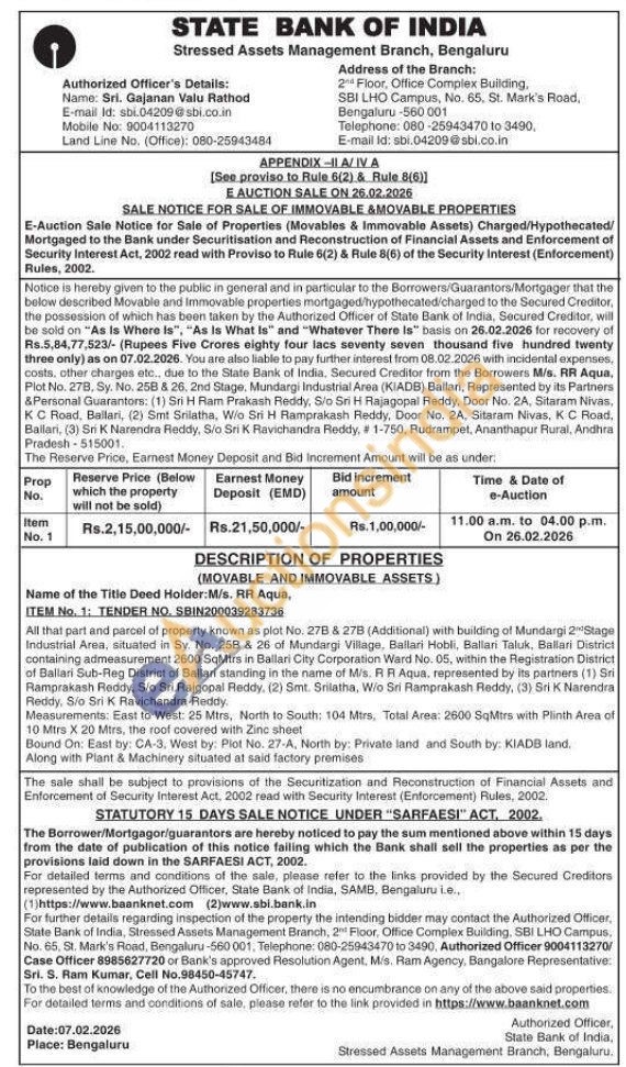All that part and parcel of property known as plot No. 278 & 27B (Additional) with building of Mundargi 2 Stage Industrial Area, situated in Sy. No. 258 & 26 of Mundargi Village, Ballari Hobli, Ballari Taluk, Ballari District containing admeasurement 2600 SqMtrs in Ballari City Corporation Ward No. 05, within the Registration District of Ballari Sub-Reg District of Ballari standing in the name of M/s. R R Aqua, represented by its partners (1) Sri Ramprakash Reddy, Sio Sri Rajgopal Reddy, (2) Smt. Srilatha, W/o Sri Ramprakash Reddy, (3) Sri K Narendra Reddy, Sio Sri K Ravichandra Reddy. Measurements: East to West: 25 Mtrs, North to South: 104 Mtrs, Total Area: 2600 SqMtrs with Plinth Area of 10 Mtrs X 20 Mtrs, the roof covered with Zinc sheet Bound On: East by: CA-3, West by: Plot No. 27-A, North by: Private land and South by: KIADB land. Along with Plant & Machinery situated at said factory premises
