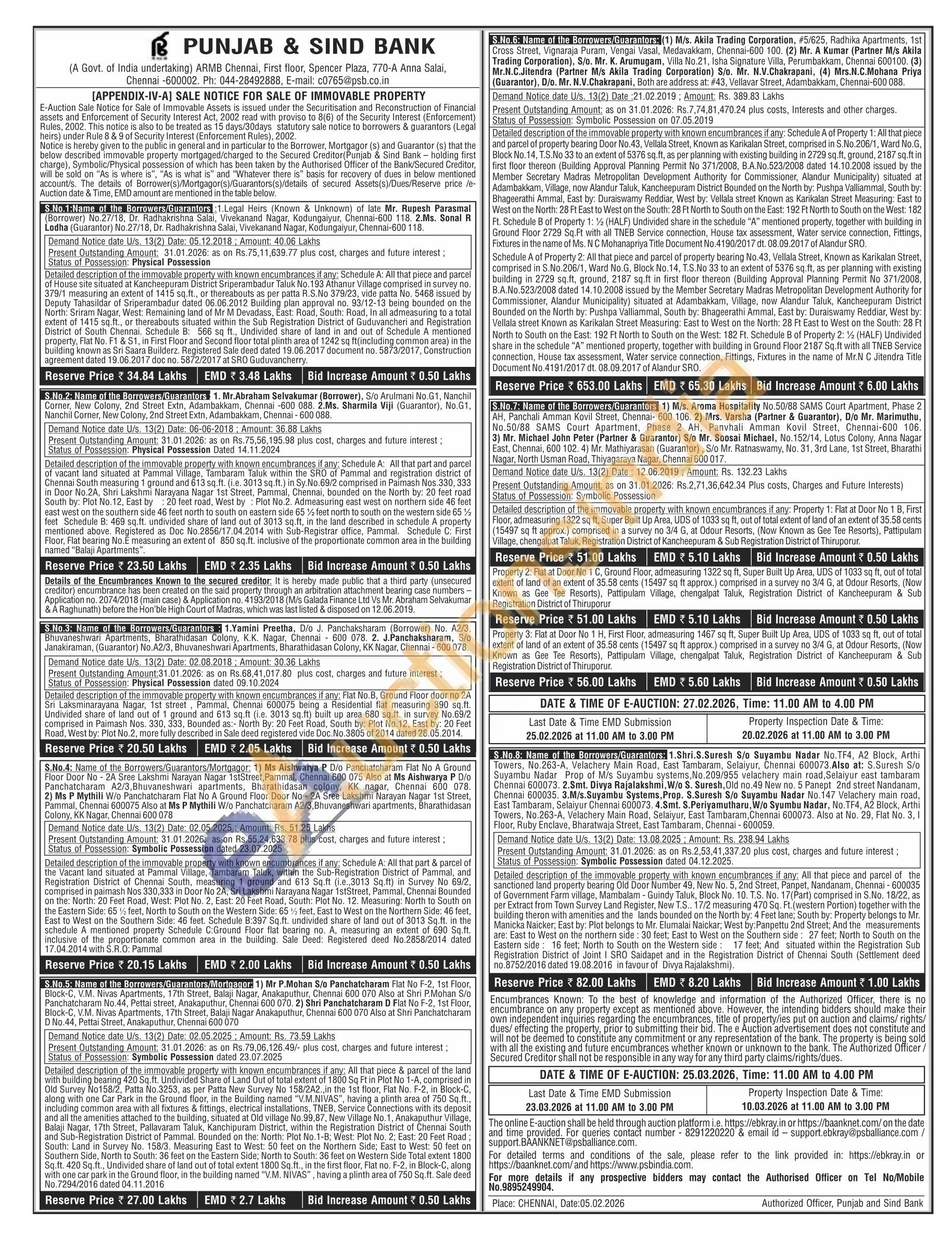 Detailed description of the immovable property with known encumbrances if any: Flat No.B, Ground Floor door no 2A Sri Laksminarayana Nagar, 1st street, Pammal, Chennai 600075 being a Residential flat measuring 390 sq.ft. Undivided share of land out of 1 ground and 613 sq.ft (i.e. 3013 sq.ft) built up area 680 sq.ft. in survey No.69/2 comprised in Paimash Nos. 330, 333, Bounded as:- North By: 20 Feet Road, South by: Plot No.12, East by: 20 Feet Road, West by: Plot No.2, more fully described in Sale deed registered vide Doc. No.3805 of 2014 dated 28.05.2014