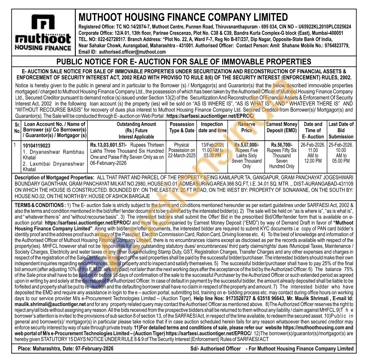 Description of Mortgaged Properties: ALL THAT PART AND PARCEL OF THE PROPERTY BEING KAMLAPUR TA, GANGAPUR, GRAM PANCHAYAT JOGESHWARI BOUNDARY GAONTHAN, GRAM PANCHAYAT MILKAT NO.2980, HOUSE NO.01, ADMEASURING AREA 366 SQ.FT, I.E. 34.01 SQ. MTR... DIST-AURANGABAD-431109 ON WHICH THE HOUSE IS CONSTRUCTED. BOUNDED BY: ON THE EAST BY: 20 FT ROAD, ON THE WEST BY: PROPERTY OF SONAWANE, ON THE SOUTH BY: HOUSE NO.02, ON THE NORTH BY: HOUSE OF ASHOK BARGAJE