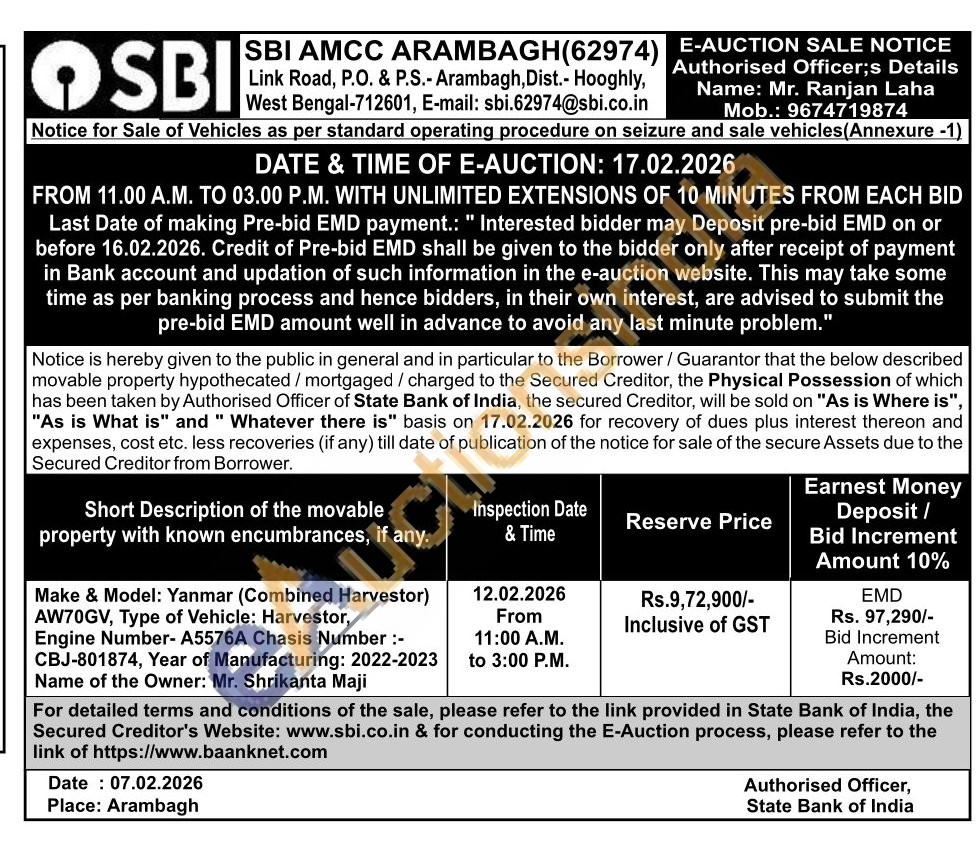 Make & Model: Yanmar (Combined Harvestor) AW70GV, Type of Vehicle: Harvestor, Engine Number- A5576A Chasis Number :-CBJ-801874, Year of Manufacturing: 2022-2023 Name of the Owner: Mr. Shrikanta Maji