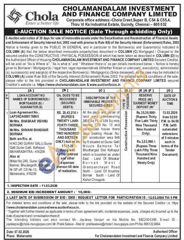 All the piece and parcel of 3809 Sq Ft Le 354 Sq mtrs bearing CTS No. 13 and constructed house there land area admeasuring upon bearing House No. 261 construction area 546 Sq ft situated at Gurav Galli Mouze Bamane Tal Bhudhargad Dist Kolhapur which is bounded as under East Land Of Bhaskar Bornak West Grampanchayat Road North Land Of Krushna Bornak South Land Of Kishor Chougule