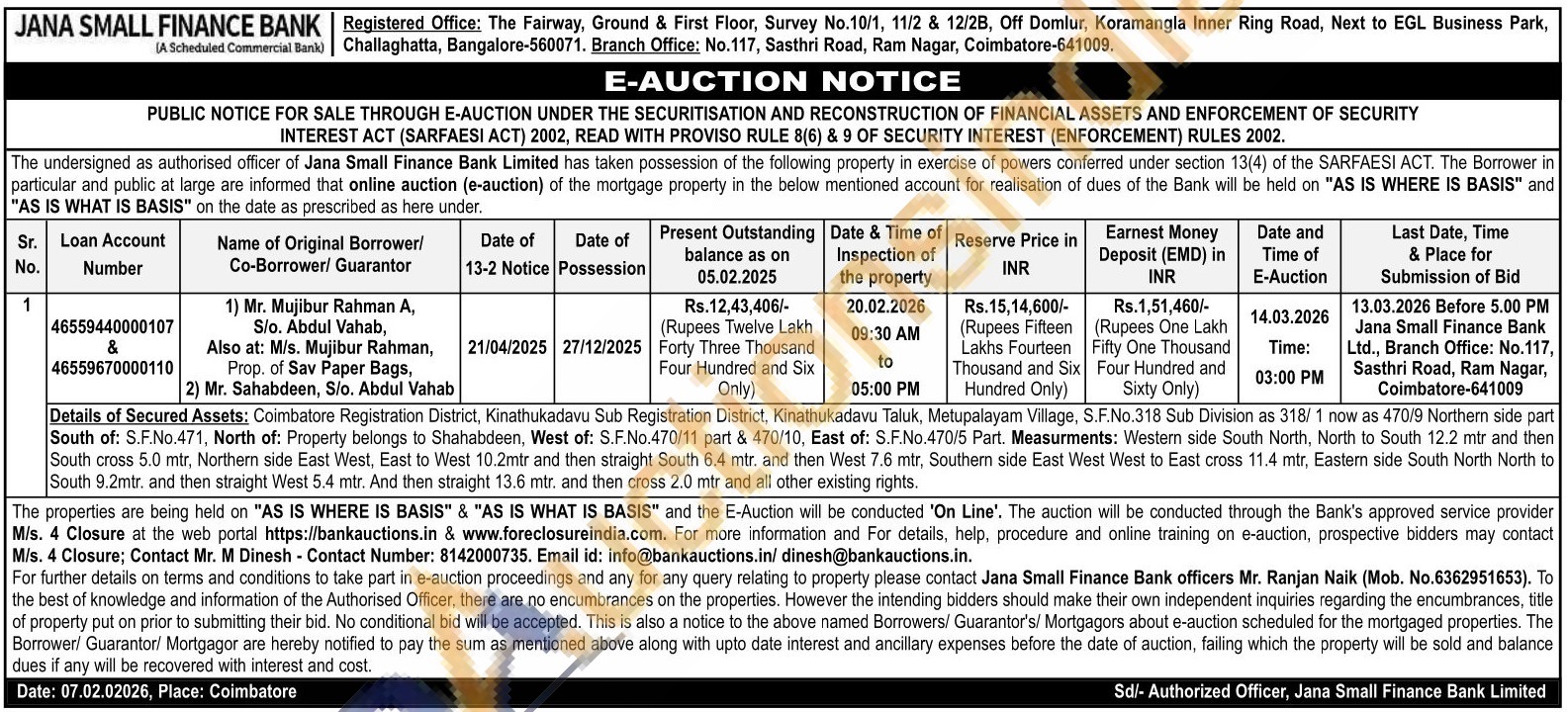 Details of Secured Assets: Coimbatore Registration District, Kinathukadavu Sub Registration District, Kinathukadavu Taluk, Metupalayam Village, S.F.No.318 Sub Division as 318/ 1 now as 470/9 Northern side part South of: S.F.No.471, North of: Property belongs to Shahabdeen, West of: S.F.No.470/11 part & 470/10, East of: S.F.No.470/5 Part. Measurments: Western side South North, North to South 12.2 mtr and then South cross 5.0 mtr, Northern side East West, East to West 10.2mtr and then straight South 6.4 mtr. and then West 7.6 mtr, Southern side East West West to East cross 11.4 mtr, Eastern side South North North to South 9.2mtr. and then straight West 5.4 mtr. And then straight 13.6 mtr. and then cross 2.0 mtr and all other existing rights