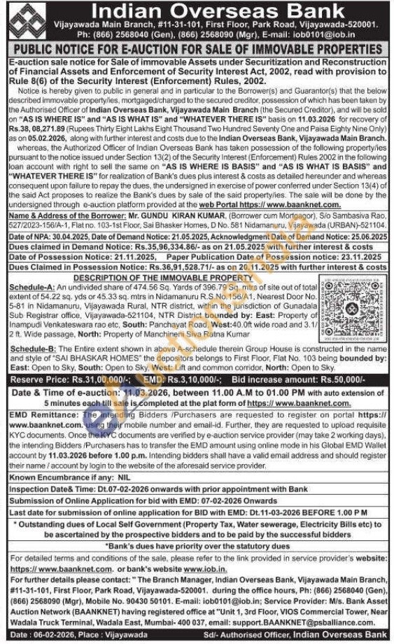 Schedule-A: An undivided share of 474.56 Sq. Yards of 396.79 Sq. mtrs of site out of total extent of 54.22 sq. yds or 45.33 sq. mtrs in Nidamanuru R.S.No. 156/A1, Nearest Door No. 5-81 in Nidamanuru, Vijayawada Rural, NTR district, within the jurisdiction of Gunadala Sub Registrar office, Vijayawada-521104, NTR District bounded by: East: Property of Inampudi Venkateswara rao etc, South: Panchayat Road, West:40.0ft wide road and 3.1/2 ft. Wide passage, North: Property of Manchineni Siva Ratna Kumar