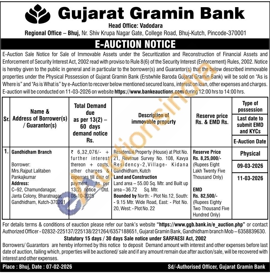Authorized Officer-02832225137 / 225138 / 221264 / 6357188651 / Gandhidham branch Mobile No :-6358839630