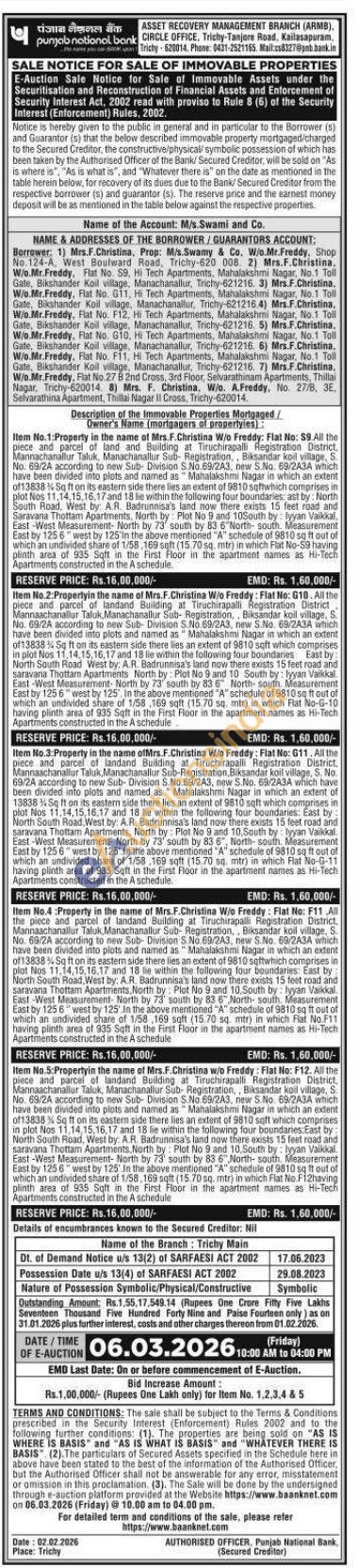 Item No.3:Property in the name ofMrs.F.Christina W/o Freddy: Flat No: 611. All the piece and parcel of landand Building at Tiruchirapalli Registration District, Mannaachanallur Taluk, Manachanallur Sub-Registration, Biksandar koil village, S. No. 69/2A according to new Sub-Division S.No 69/243, new S.No. 69/2A3A which have been divided into plots and named as Mahalakshmi Nagar in which an extent of 13838% Sq ft on its eastern side there lies an extent of 9810 sqft which comprises in plot Nos 11,14,15,16,17 and 18 be within the following four boundaries: East by: North South Road, West by: A.R. Badrunnisa's land now there exists 15 feet road and saravana Thottam Apartments, North by: Plot No 9 and 10. South by lyyan Vaikkal East-West Measurement- North by 73' south by 83 6", North-south. Measurement East by 125 6 west by 125. In the above mentioned "A" schedule of 9810 sq ft out of which an undivided share of 1/58,169 sqft (15.70 sq. mtr) in which Flat No-G-11 having plinth area of 935 Sqft in the First Floor in the apartment names as Hi-Tech Apartments constructed in the A schedule