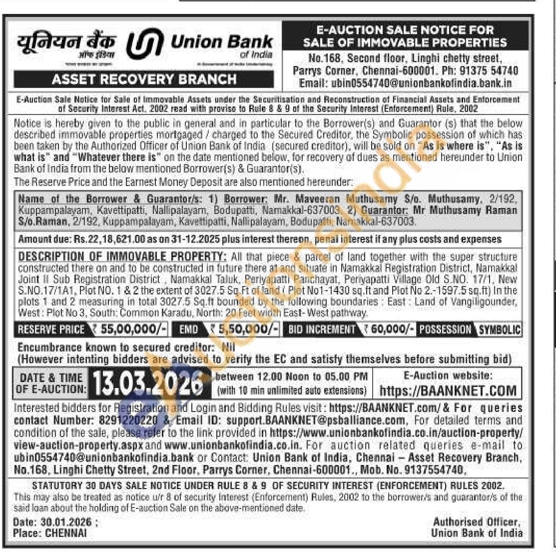 DESCRIPTION OF IMMOVABLE PROPERTY: All that piece & parcel of land together with the super structure constructed there on and to be constructed in future there at and situate in Namakkal Registration District, Namakkal Joint II Sub Registration District, Namakkal Taluk, Periyapatti Panchayat, Periyapatti Village Old S.NO. 17/1, New S.NO.17/1A1, Plot NO. 1 & 2 the extent of 3027.5 Sq.Ft of land (Plot No1-1430 sq.ft and Plot No 2.-1597.5 sq.ft) In the plots 1 and 2 measuring in total 3027.5 Sq.ft bounded by the following boundaries: East: Land of Vangiligounder, West: Plot No 3, South: Common Karadu, North: 20 Feet width East-West pathway