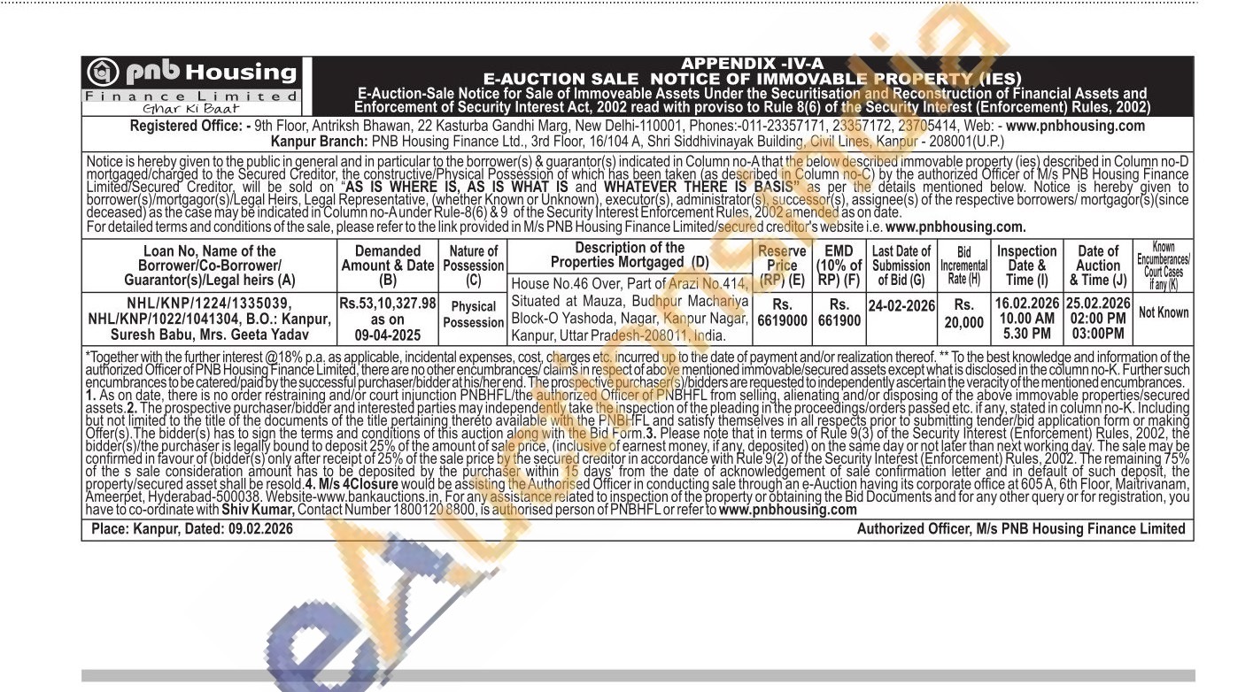 House No.46 Over, Part of Arazi No.414, Situated at Mauza, Budhpur Machariya Block-O Yashoda, Nagar, Kanpur Nagar. Kanpur, Uttar Pradesh-208011, India.