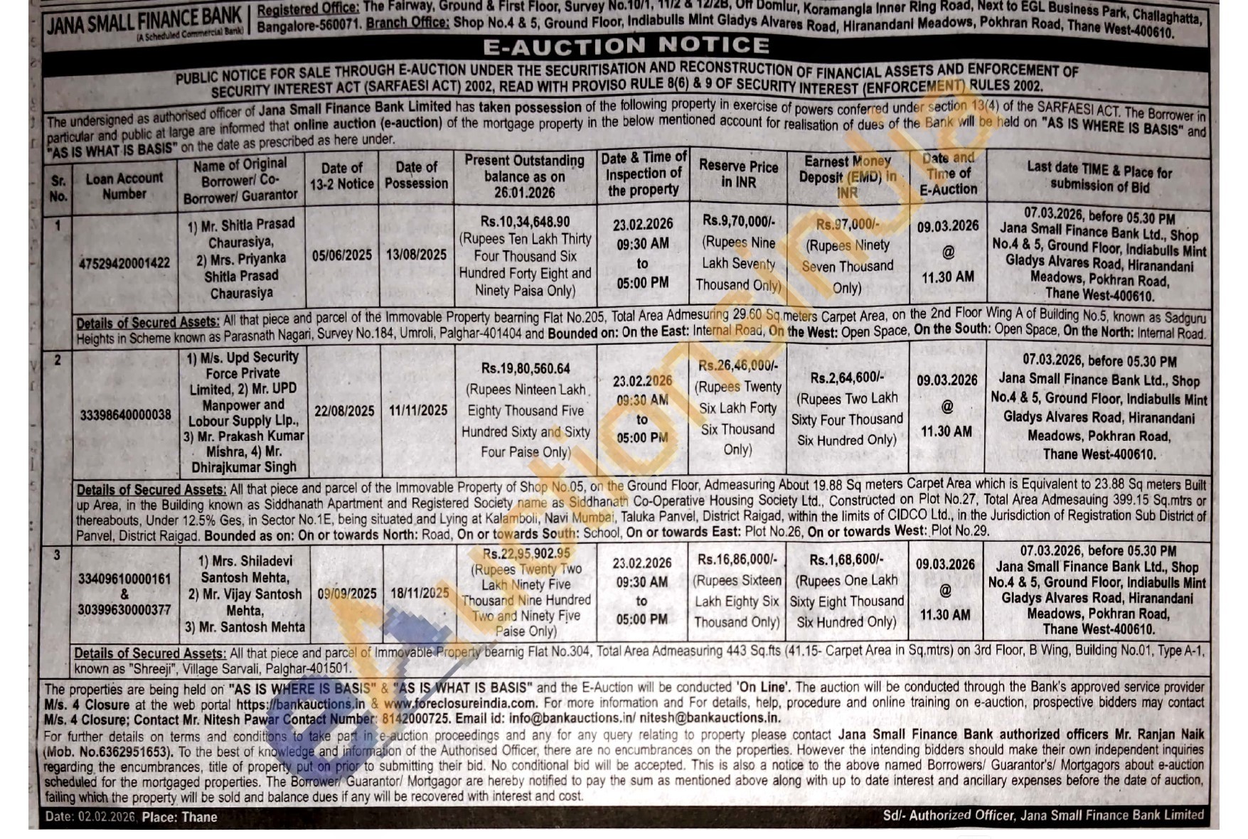 Details of Secured Assets; All that piece and parcel of Immovable Property bearnig Flat No.304, Total Area Admeasuring 443 Sq.fts (41.15- Carpet Area in Sq.mtrs) on 3rd Floor, B Wing, Building No.01, Type A-1, known as "Shreeji", Village Sarvali, Palghar-401501