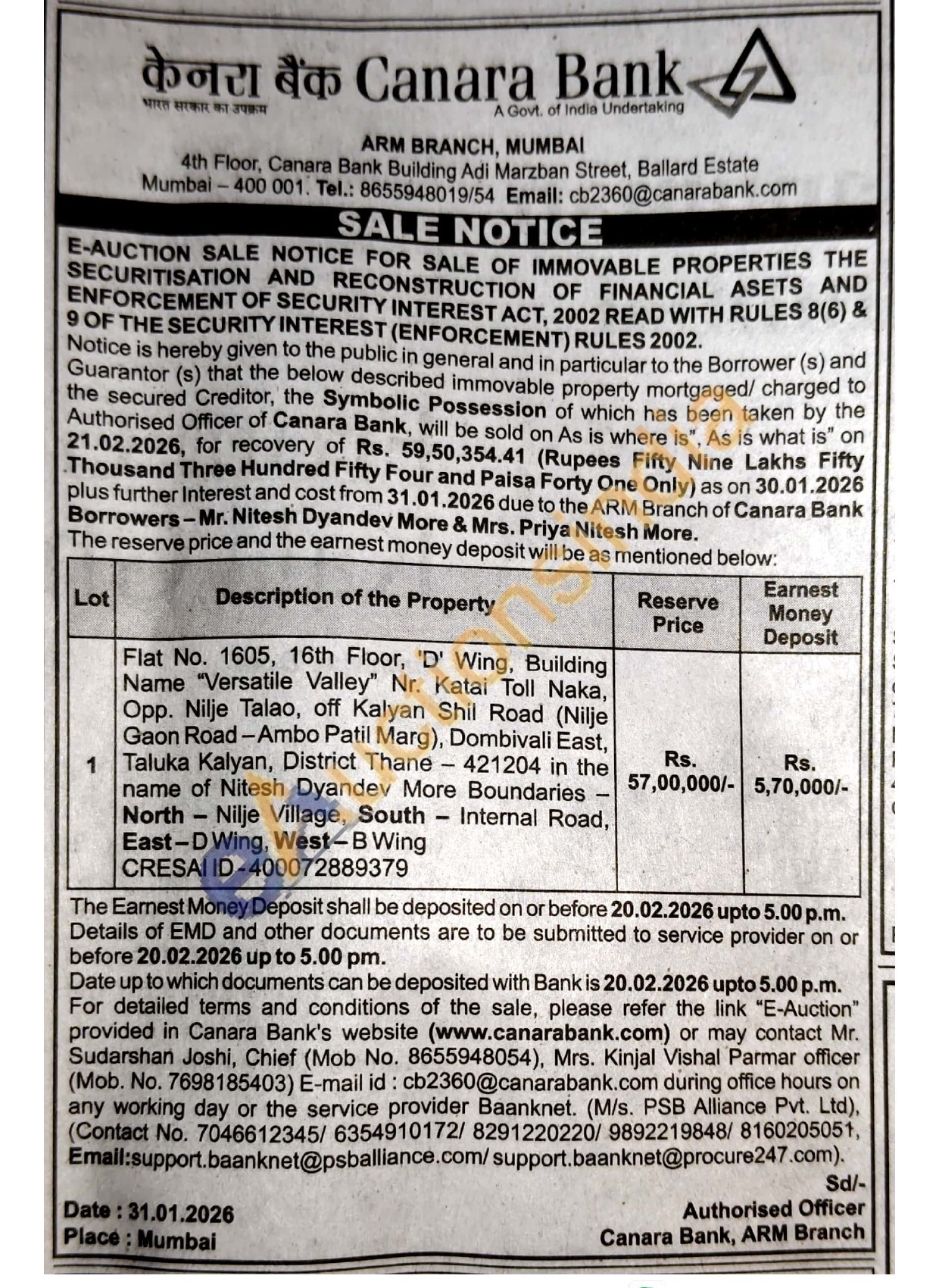Flat No. 1605, 16th Floor, 'D' Wing, Building Name "Versatile Valley" Nr. Katai Toll Naka, Opp. Nilje Talao, off Kalyan Shil Road (Nilje Gaon Road-Ambo Patil Marg), Dombivali East, Taluka Kalyan, District Thane 421204 in the name of Nitesh Dyandev More Boundaries -North Nilje Village, South Internal Road, East-D Wing, West-B Wing CRESAI ID-400072889379