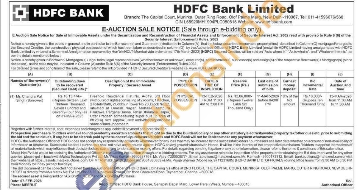 Freehold Residential Flat No. A-319, 3rd Floor (without roof rights) consisting of 2 rooms, 1 Kitchen, 2. Toilets/Bath, 2 Lobby in Tower No.23, Block No.22, situated at Dinesh Nagar, Mohalla Rampura Pilakhwa, Pargana Dasna, Tehsil Dhaulana, Hapur, Uttar Pradesh admeasuring super built up area of 88.28 sq. mirs. (approx..) with undivided proportionale share of land underneath