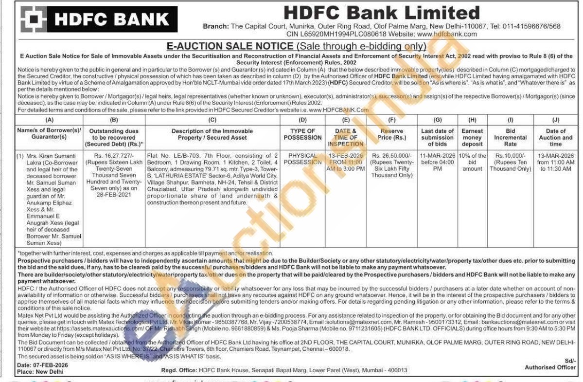 Flat No. LE/B-703, 7th Floor, consisting of 2 Bedroom, 1 Drawing Room, 1 Kitchen, 2 Toilet, 4 Balcony, admeasuring 79.71 sq. mtr. Type-3, Tower-B. LATHURIA ESTATE Sector-6, Aditya World City, Village Shahpur, Bamheta, NH-24, Tehsil & District Ghaziabad, Uttar Pradesh alongwith undivided proportionate share of land underneath & construction thereon present and future