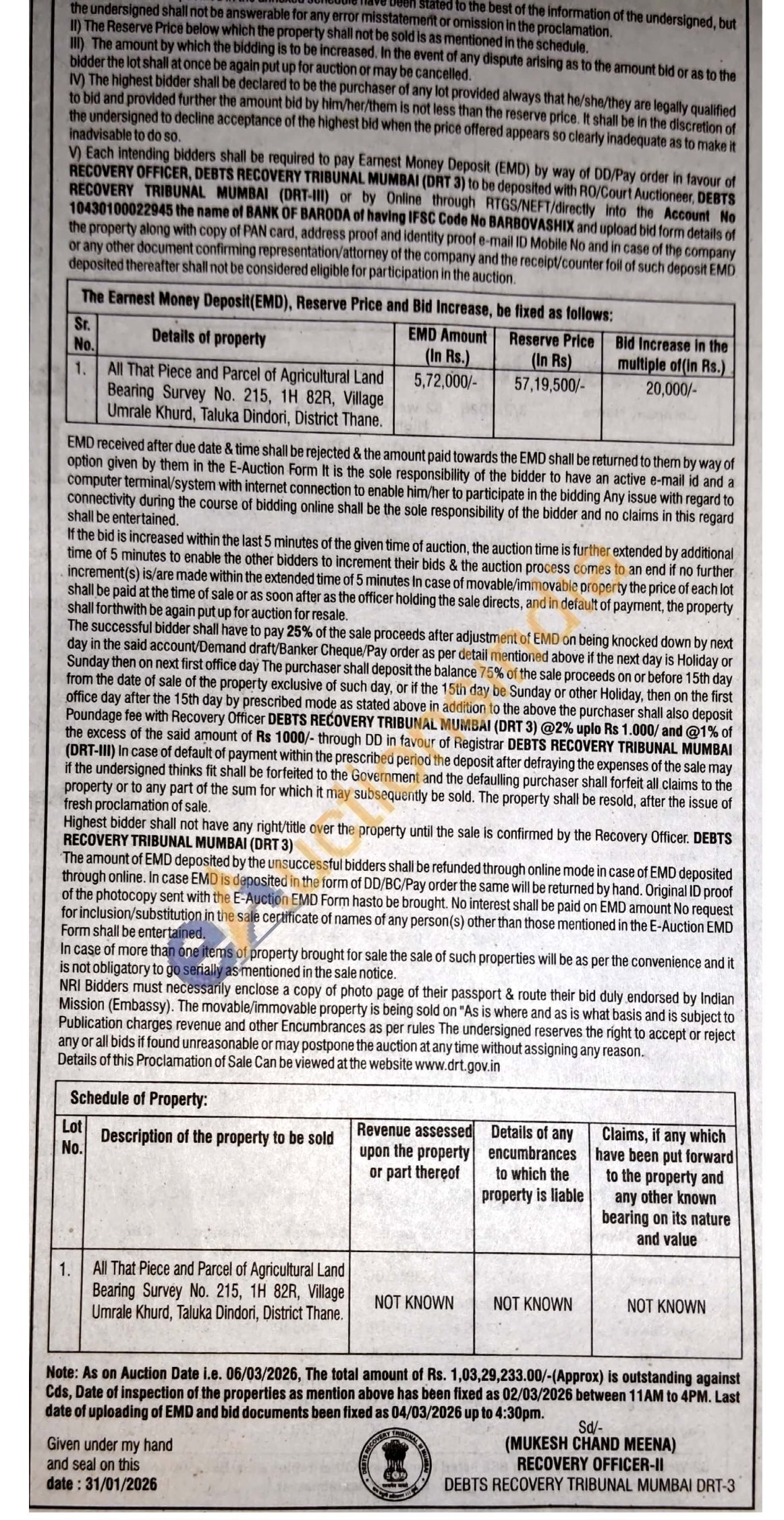 1. All That Piece and Parcel of Agricultural Land Bearing Survey No. 215, 1H 82R, Village Umrale Khurd, Taluka Dindori, District Thane.