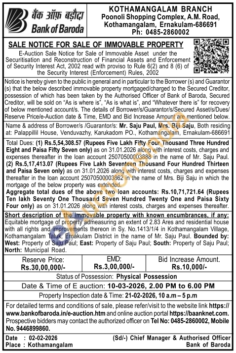 Short description of the immovable property with known encumbrances, if any: Equitable mortgage of property admeasuring an extent of 2.83 Ares and residential house with all rights and improvements thereon in Sy. No. 1413/1/4 in Kothamangalam Village, Kothamangalam Taluk, Ernakulam District in the name of Mr. Saju Paul. Bounded by: West: Property of Saju Paul; East: Property of Saju Paul; South: Property of Saju Paul; North: Municipal Road.