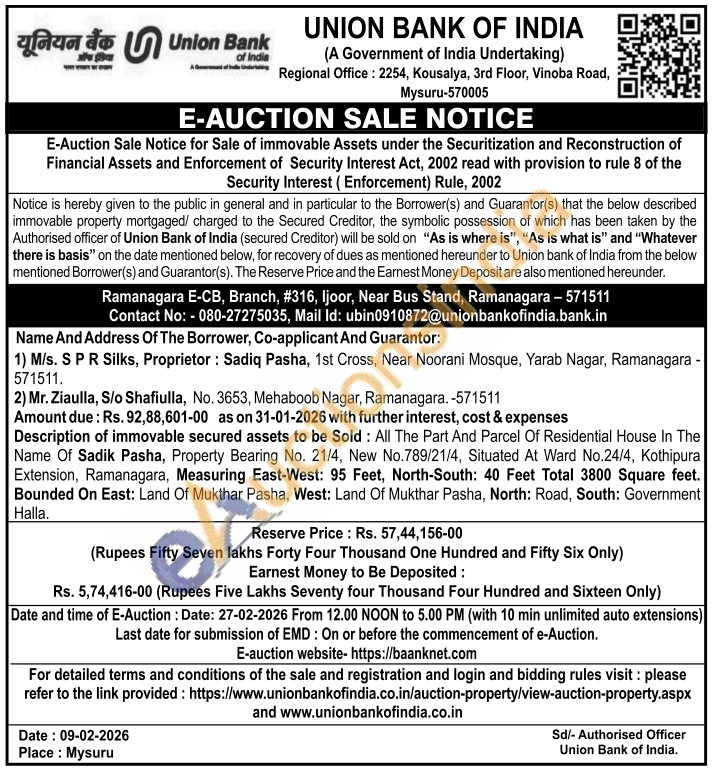 Description of immovable secured assets to be Sold: All The Part And Parcel Of Residential House In The Name Of Sadik Pasha, Property Bearing No. 21/4, New No.789/21/4, Situated At Ward No.24/4, Kothipura Extension, Ramanagara, Measuring East-West: 95 Feet, North-South: 40 Feet Total 3800 Square feet. Bounded On East: Land Of Mukthar Pasha, West: Land Of Mukthar Pasha, North: Road, South: Government Halla.
