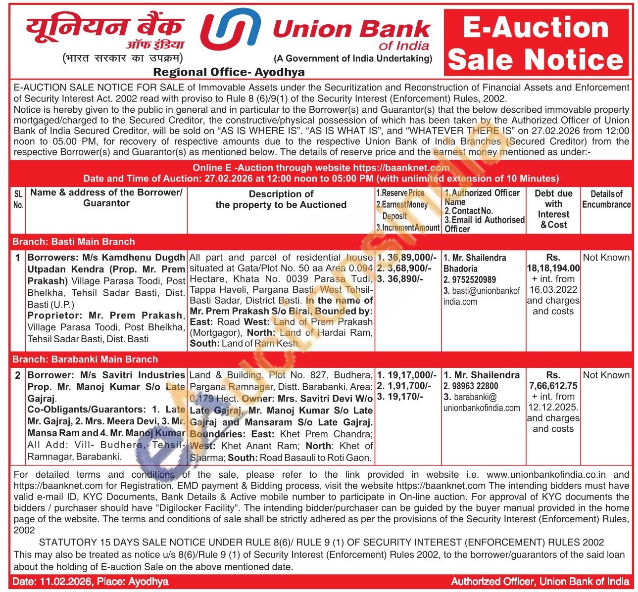 Land & Building, Plot No. 827, Budhera, Pargana Ramnagar, Distt. Barabanki. Area: 0.179 Hect. Owner: Mrs. Savitri Devi W/o Late Gajraj, Mr. Manoj Kumar S/o Late Gajraj and Mansaram S/o Late Gajraj. Boundaries: East: Khet Prem Chandra; West: Khet Anant Ram; North: Khet of Sharma: South: Road Basauli to Roti Gaon.