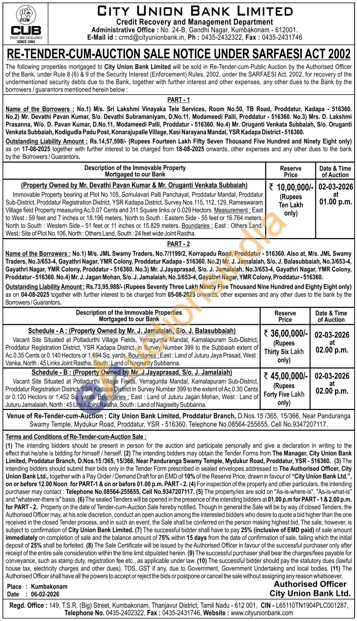Vacant Site Situated at Potladurthi Village Fields, Yerraguntla Mandal, Kamalapuram Sub-District, Proddatur Registration District, YSR Kadapa District, in Survey Number 399 to the Subbaiah extent of Ac.0.35 Cents or 0.140 Hectors or 1,694 Sq, yards. Boundaries: East: Land of Juturu Jaya Prasad. West: Vanka, North: 45 Links Joint Rastha, South: Land of Nagisetty Subbanna.