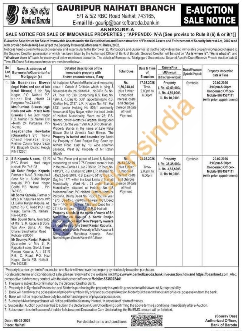 All that piece & Parcel of Bastu Land measuring about 1 Cottah 8 Chittaks which is lying & Situated at Mouza-Naihati JL. No 3 Re. Su No. 21. Touzi No 630, Comprising R.S. Dag No. 4284, L.R. Dag No. 3681, appertaining to R.S. Khatian No. 2137, L.R. Khatian No. 491 Hal 8931, under Holding No 803/1 commonly known as 6 Bijay Nagar, within the local Limits of Naihati Municipality, Ward no 23, P.S. Naihati, district-North 24 Pargana. Being Deed No4797, for the year 1998.A.D.S.RO Naihati Property stands in the name of Late Netal Biswas Sio Lt Upendra Nath Biswas. The Property is butted and bounded by: North by: Property of Santi Ranjan Roy, South by: Adhata Road. East by. 10' wide common passage, West By: Property of Mr Ratan