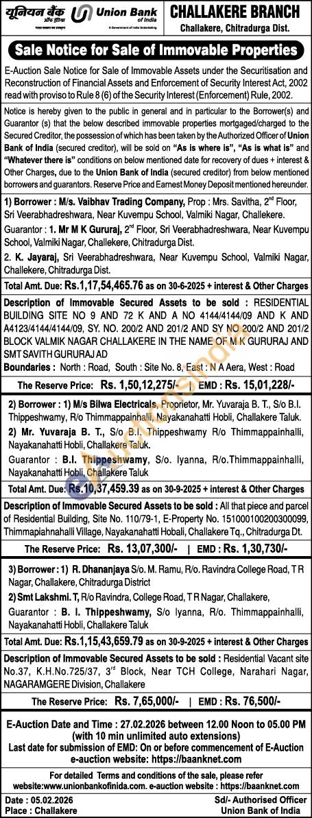Description of Immovable Secured Assets to be sold: Residential Vacant site No.37, Κ.Η.No. 725/37, 3 Block, Near TCH College, Narahari Nagar, NAGARAMGERE Division, Challakere