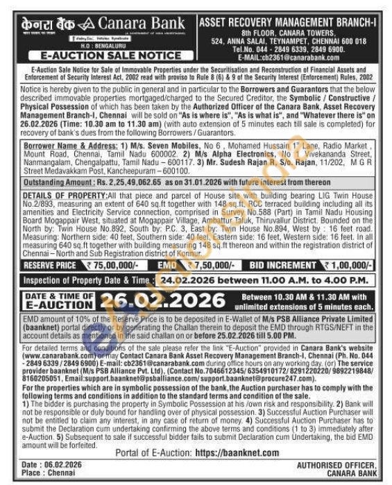 DETAILS OF PROPERTY: All that piece and parcel of House site with building bearing LIG Twin House No.2/893, measuring an extent of 640 sq.ft together with 148 sq.ft, RCC terraced building including all its amenities and Electricity Service connection, comprised in Survey No.588 (Part) in Tamil Nadu Housing Board Mogappair West, situated at Mogappair Village, Ambattur Taluk, Thiruvallur District. Bounded on the North by. Twin House No.892, South by: P.C. 3. East by: Twin House No.894, West by: 16 feet road. Measuring: Northern side: 40 feet, Southern side: 40 feet, Eastern side: 16 feet, Western side: 16 feet. In all measuring 640 sq.ft together with building measuring 148 sq.ft thereon and within the registration district of Chennai-North and Sub Registration district of Konnur.