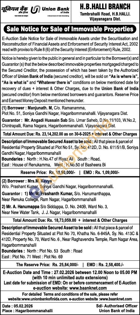 Description of Immovable Secured Asset to be sold: All that piece & parcel of Residential Property Situated at Plot No 51, Sy. No. 412D, D. No. 611/51/B, Soniya Gandhi Nagar, Hagaribommanahalli