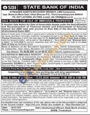 DESCRIPTION OF IMMOVABLE PROPERTY: All that part and parcel of the property fogether with residental building and all improvements and structures in 3.80 Ares & 3.45 Ares of land in Re.Sy No. 113/32 & 113/31 in Chemmaruthy Village, Varkala Taluk Thiruvananthapuram district, covered by the Sak Deed No. 1134/2022 dated 31.03.2022 of SRO Varkala in the name of Shei. Sathish Sadanandan, BOUNDED by: North: Property of Babu, South Property of Jayanthi, East: Panchayath Road and West: Property of Velu ad Bhavani