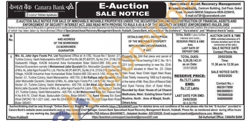 Property No 1All that piece and parcel of Residential House bearing C.M.C. No. 18-1-22/1 (old) corresponding to new No. 23-6-626-13-A situated in Ward No. 23. Chidri Main Road, Near Chidri Idgah Main Road, Bidar Totally measuring 1906 sq ft standing in the name of Md. Rias (Son of Rasool Sab) and Syed Farooq (Son of Syed Afzal), Bounded by:-East: House of Lal Chaand Madhubala, West: Existing Grave Yard of Muslims, North: Area of Masjid, South: Others Area.