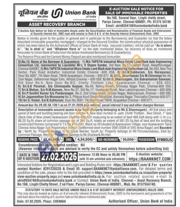 Description of immovable secured assets to be Sold: (Property belonging to Mr.G.Shanmugam): All that piece and parcel of land and building bearing old door number 4, New door number 9-part, Chetti Thottam, New Street, 1 lane (Back Side of New street) Ayanavaram Chennai-600 023 measuring to an extent of land 495 Sqft along with 14 th (ie. 86.25 Sq.ft) share of common passage out of 345 Sq.ft, totally an extent of 581.25 Sq.feet of land and the building constructed thereon comprised in T.S. No. 87/1 Part, Block no.24 situated at Ayanavaram Village, now Ayanavaram Taluk Chennai Anna Nagar Sub Registration District (Settlement deed number 2681/2009 of SRO Anna Nagar) and Bounded by: North by: Property belongs to Mr.Gopal Naicker, South by. Property belongs to Mr. Thirunavukarasu, East by: Common Passage, West by: House site belongs to Mr. Shankar& Mr.Hari