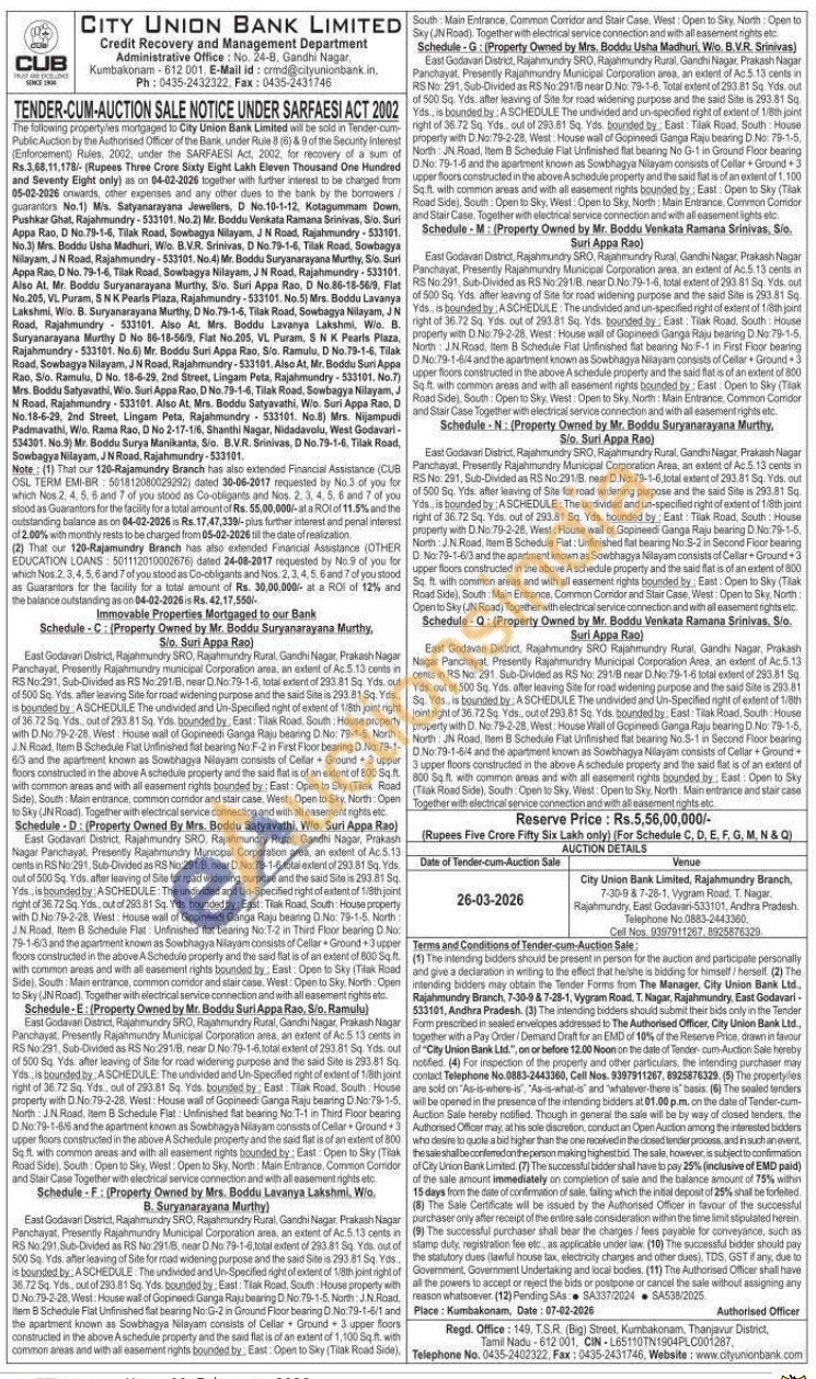 East Godavari District, Rajahmuridry SRO Rajahmundry Rural, Gandhi Nagar, Prakash Nagar Panchayat, Presently Rajahmundry Municipal Corporation Area, an extent of Ac 5.13 cents in RS No. 291 Sub-Divided as RS No: 291/B near D.No 79-1-6 total extent of 293.81 Sq. Yds: out of 500 Sq. Yds, after leaving Site for road widening purpose and the said Sitle is 293.81 Sq. Yds., is bounded by A SCHEDULE The undivided and Un-Specified right of extent of 1/8th joint right of 36.72 Sq. Yds, out of 293.81 Sq. Yds. bounded by East: Tilak Road, South: House property with D. No. 79-2-28 West House Wall of Gopineedi Ganga Raju bearing D.No: 79-1-5, North: JN Road, Item B Schedule Flat Urifinished flat bearing No.S-1 in Second Floor bearing D.No:79-1-6/4 and the apartment known as Sowbhagya Nilayam consists of Cellar + Ground + 3 upper floors constructed in the above A schedule property and the said flat is of an extent of 800 Sq.ft. with common areas and with all easement rights bounded by East: Open to Sky (Tlak Road Side), South: Open to Sky, West. Open to Sky, North. Main entrance and stair case Together with electrical service connection and with all easement rights etc