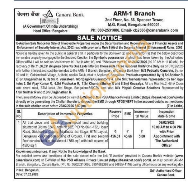 All that piece and parcel of commercial land and building situated at Old no 324/2, new no 132, PID No.66-1-132, Hosur Road, Siddhartha Colony, Madiwala 1st Stage, BTM Layout, Bengaluru -560068 comprising of Ground, First and second floor constructed on plot area of 1750 sq ft with built up area of 4500 sq ft