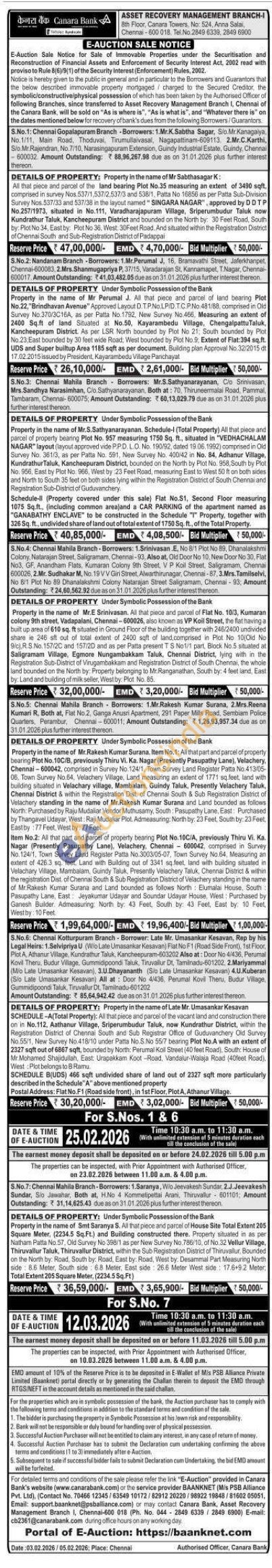 Property in the name of Mr.S.Sathyanarayanan. Schedule-l (Total Property) All that piece and parcel of property beanng Plot No. 957 measuring 1750 Sq. ft., situated in "VEDHACHALAM NAGAR" layout (layout approved vide P.PD.L.O. No. 190/92, dated 19.06.1992) comprised in Old Survey No. 361/3, as per Patta No. 591, New Survey No. 40042 in No. 84, Adhanur Village, Kundrathur Taluk, Kancheepuram District, bounded on the North by Plot No. 958, South by Plot No. 956, East by Plot No 966, West by 23 Feet Road, measuring East to West 50 ft on both sides and North to South 35 feet on both sides lying within the Registration District of South Chennal and Registration Sub-District of Guduvanchery Schedule-II (Property covered under this sale) Flat No.S1, Second Floor measuring 1075 Sq.ft., (including common areajand a CAR PARKING of the apartment named as "GANABATHY ENCLAVE to be constructed in the Schedule "I" Property, together with 326 Sq. ft., undivided share of land out of total extent of 1750 Sq. ft., of the Total Property