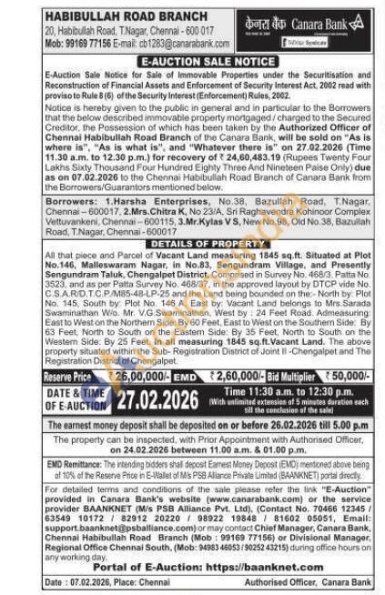 All that piece and Parcel of Vacant Land measuring 1845 sq.ft. Situated at Plot No.146, Malleswaram Nagar, in No.83, Sengundram Village, and Presently Sengundram Taluk, Chengalpet District, Comprised in Survey No. 468/3, Patta No. 3523, and as per Patta Survey No. 468/37, in the approved layout by DTCP vide No. C.SARD.TCP/M85-48-LP-25 and the Land being bounded on the North by: Plot No. 145, South by Plot No. 146 A. East by: Vacant Land belongs to Mrs Sarada Swaminathan Wilo. Mr. V.G.Swaminathan, West by: 24 Feet Road. Admeasuring East to West on the Northern Side: By 60 Feet, East to West on the Southern Side: By 63 Feet, North to South on the Eastem Side: By 35 Feet, North to South on the Western Side: By 25 Feet. In all measuring 1845 sq.ft. Vacant Land. The above property situated within the Sub-Registration District of Joint II -Chengalpet and The Registration District of Chengalpet.