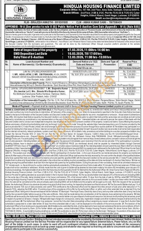 Description of the Immovable Property: Plot No. C-74, Part of Khasra No-283VS & 283A Paharpur, Pargana-Bijnaur, Tehsil-Sarojini Nagar, District Lucknow. Area admeasuring 139.405 Sq. Mtr. Direction Boundaries: East: Plot No. 81, West: Road 25Ft wide, North: Plot No.75, South: Plat No. 73