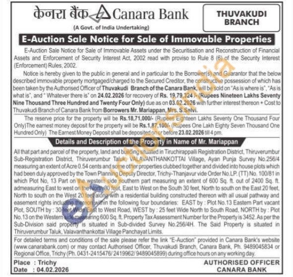All that part and parcel of the property, land and building situated in Tiruchirappalli Registration District, Thiruverumbur Sub-Registration District, Thiruverumbur Taluk, VALAVANTHANKOTTAI Village, Ayan Punja Survey No.256/4 measuring an extent of Acre 0.54 cents and some other properties clubbed together and divided into house plots which had been duly approved by the Town Planning Deputy Director, Trichy-Thanjavur vide Order No.LP. (TT) No. 100/81 in which Plot No, 13 Part on the western side southern part measuring an extent of 600 Sq. ft. out of 2400 Sq. ft. admeasuring East to west on the North 30 feet, East to West on the South 30 feet, North to south on the East 20 feet, North to south on the West 20 feet along with a residential building constructed thereon with all usual pathway and easement rights including thereon within the following four boundaries: EAST by: Plot No.13 Eastern Part vacant Plot, SOUTH by: 30 feet Wide East to West Road, WEST by: 25 feet Wide North to South Road, NORTH by: Plot No. 13 on the Westen side measuring 600 Sq. ft. Property Tax Assessment Number for the Property is 3452. As per the Sub-Division said property is situated in Sub-divided Survey No.258/4H. The Said Property is situated in Thiruverumbur Taluk, Valavanthankottai Village Panchayat Limits.