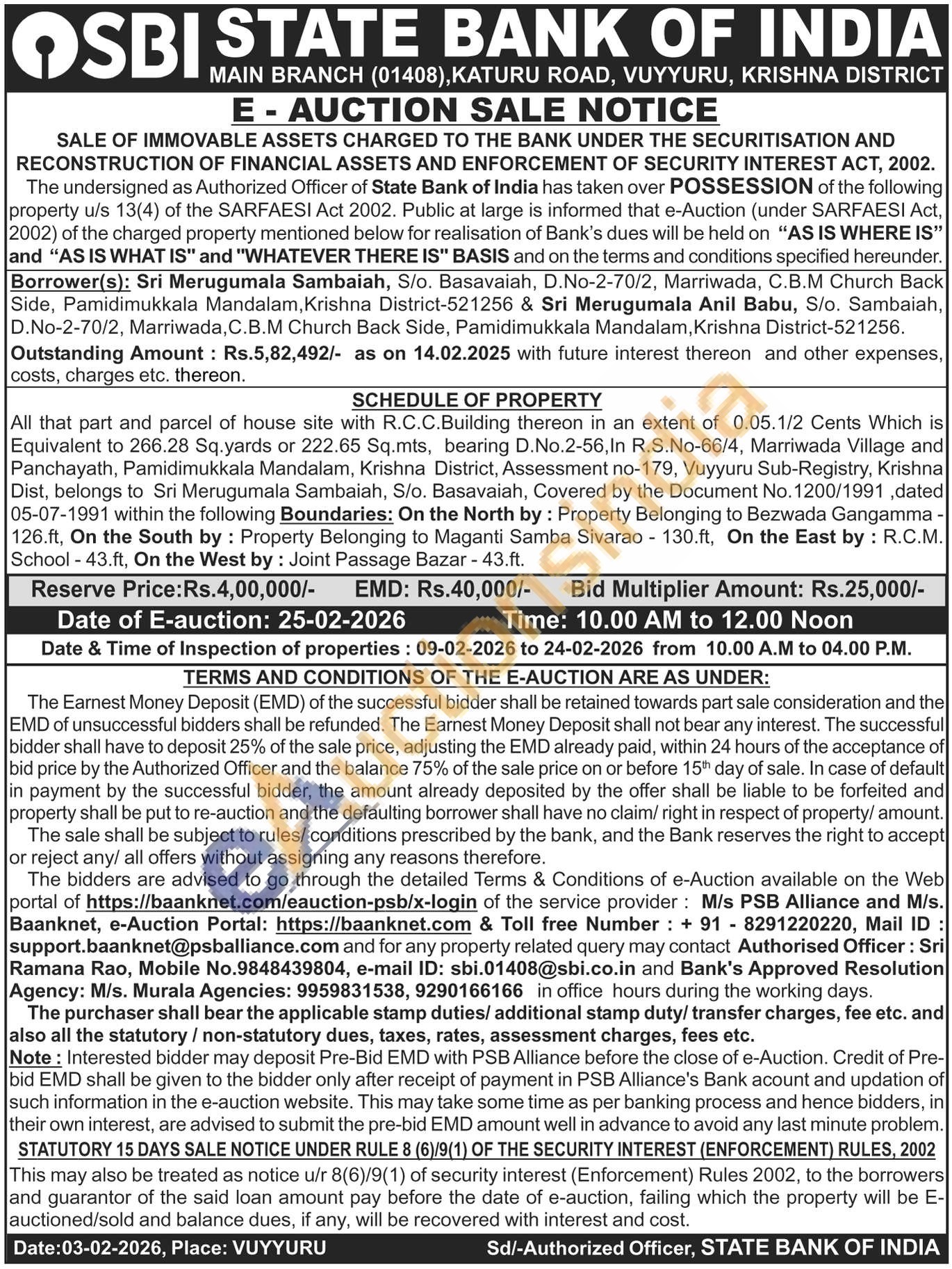 All that part and parcel of house site with R.C.C.Building thereon in an extent of 0.05.1/2 Cents Which is Equivalent to 266.28 Sq.yards or 222.65 Sq.mts, bearing D.No.2-56, In R.S.No-66/4, Marriwada Village and Panchayath, Pamidimukkala Mandalam, Krishna District, Assessment no-179, Vuyyuru Sub-Registry, Krishna Dist, belongs to Sri Merugumala Sambaiah, S/o. Basavaiah, Covered by the Document No. 1200/1991, dated 05-07-1991 within the following Boundaries: On the North by: Property Belonging to Bezwada Gangamma -126.ft, On the South by: Property Belonging to Maganti Samba Sivarao 130.ft, On the East by: R.C.M. School-43.ft, On the West by: Joint Passage Bazar - 43.ft.