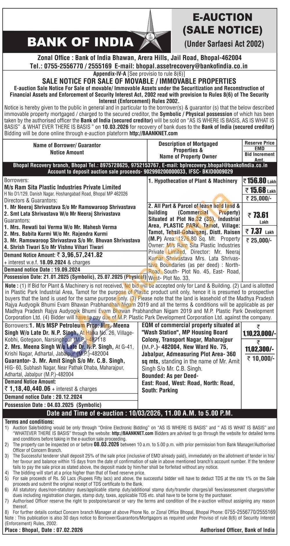 2. All Part & Parcel of lease hold land & building (Commercial Property) Situated at Plot No.32 (S5), Industrial Area, PLASTIC PARK, Tamot, Village: Tamot, Tehsil-Goharganj, Distt. Raisen (M.P) Area: 1276.80 Sq. Mt. Property Owner: M/s Ram Sita Plastic Industries Private Limited, Director: Mr. Neeraj Kumar Shrivastava Mrs. Lata Shrivas-tava Boundaries (as per deed): North-Road, South Plot No. 45, East- Road, West- Plot No. 33,