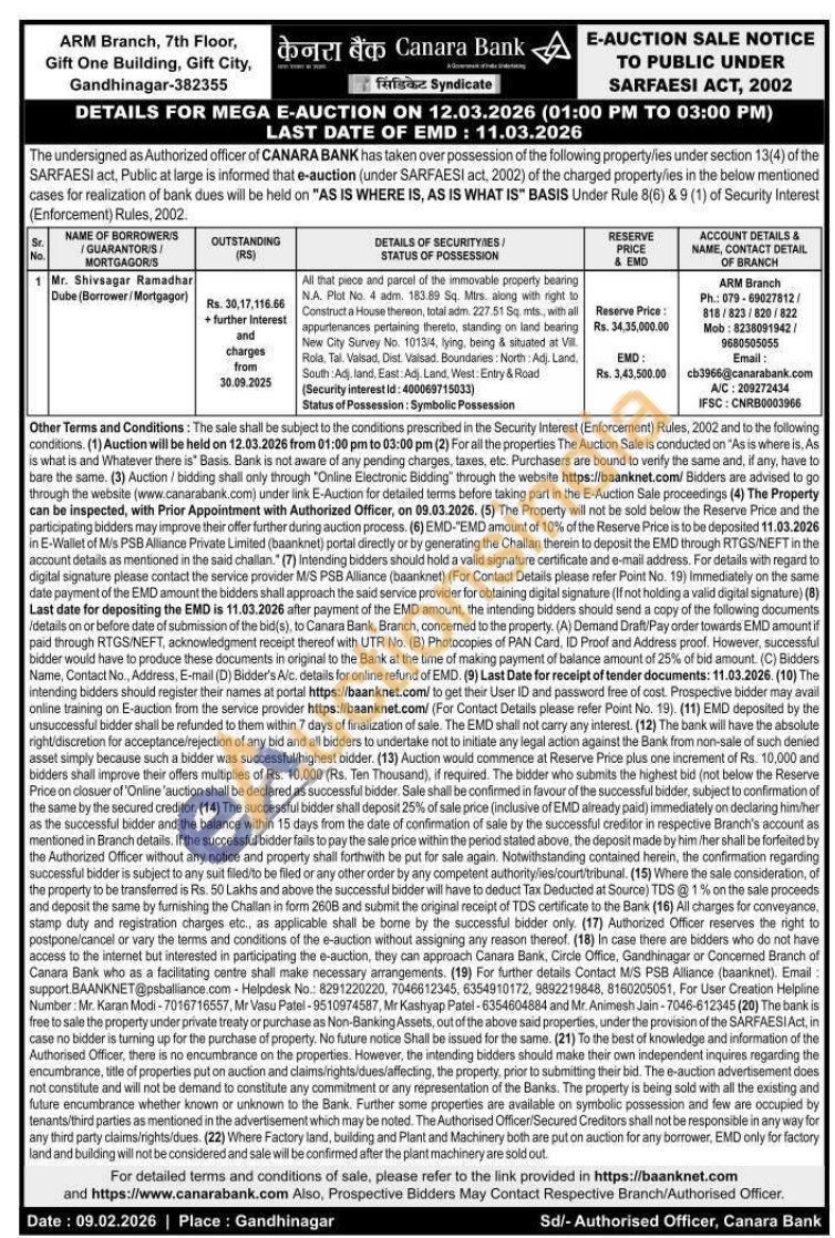 All that piece and parcel of the immovable property bearing N.A. Plot No. 4 adm. 183.89 Sq. Mrs. along with right to Construct a House thereon, total adm. 227.51 So, mts, with all appurtenances pertaining thereto, standing on land bearing New City Survey No. 1013/4, lying, being & situated at Vill Rola. Tal. Valsad, Dist. Valsad Boundaries: North: Adj, Land. South Adj land, East Adj. Land, West: Entry & Road (Security interest id: 400069715033) Status of Possession: Symbolic Possession