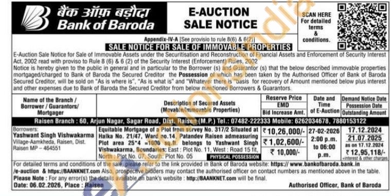 Equitable Mortgage of a Plot from survey No. 317/2 Situated at Halka No. 21/47, Ward no.14, Patandev Raisen admeasuring Plot area 25-4 1000 sq.ft. belongs to Yashwant Singh Vishwakarma, Boundaries: East: Plot No. 11, West: Road 15 fit, North: Plot No. 07, South: Plot No. 05 PHYSICAL POSSESSION