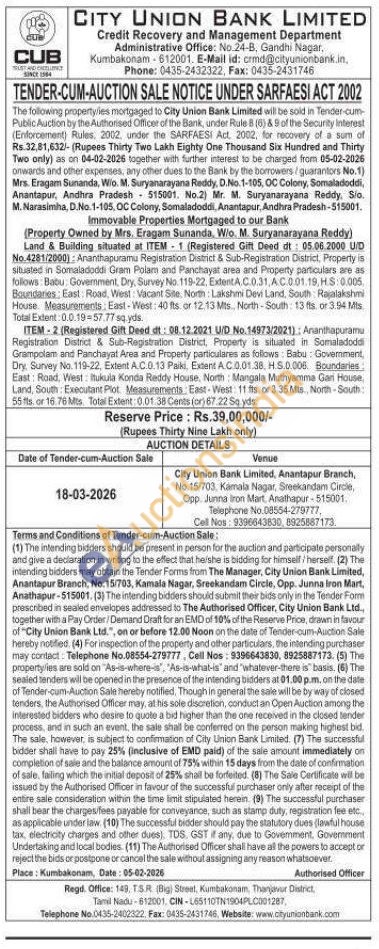 Land & Building situated at ITEM 1 (Registered Gift Deed dt: 05.06.2000 U/D No.4281/2000): Ananthapuramu Registration District & Sub-Registration District, Property is situated in Somaladoddi Gram Polanı and Panchayat area and Property particulars are as follows: Batu Government, Dry, Survey No. 119-22. Extent.A.C.0.31.A.C.0.01.19, H.S 0.005. Boundaries: East Road, West: Vacant Site. North Lakshmi Devi Land, South: Rajalakshmi House. Measurements, East-West: 40 fts or 12.13 Mts., North-South 13 fts, or 3.94 Mis Total Extent: 0.0.19-57.77 sq.yds. ITEM-2 (Registered Gift Deed dt: 08.12.2021 U/D No.14973/2021): Ananthapuramu Registration District & Sub-Registration District, Property is situated in Somaladoddi Grampolam and Panchayat Area and Property particulares as follows: Babu: Government, Dry. Survey No. 119-22, Extent A.C.0.13 Paiki, Extent A.C.0.01.38. H.S.0.006. Boundaries East: Road, West: itukula Konda Reddy House, North: Mangala Muthyamma Gan House, Land, South: Executant Plot. Measurements East-West 11 fts or 3.35 Mts North-South 55 fls. or 16.76 Mts Total Extent -0.01.38 Cents (or) 67.22 Sq yds.