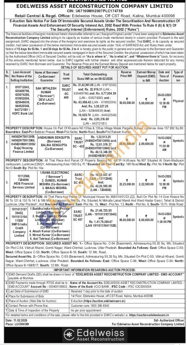 PROPERTY DESCRIPTION: SECURED ASSET NO. 1: Office Space No. C-54 (Basement), Admeasuring 55.35 Sq. Mtr, Situated On Plot C-54, Vibhuti Khand, Gomti Nagar, Ward-Chinhat, Lucknow, Uttar Pradesh. Bounded As Follows: East: Office Space C-55; West: Office Space C-53; North: Office Space B-16; South: 12 Mtr. Road. Secured Asset No. 2:- Office Space No. C-55 (Basement), Admeasuring 55.35 Sq. Mtr, Situated On Plot C-55, Vibhuti Khand, Gomti Nagar, Ward-Chinhat, Lucknow, Uttar Pradesh. Bounded As Follows: East: Office Space C-56; West: Office Space C-54; North: Office Space B-168/B17; South: 12 Mtr. Road.