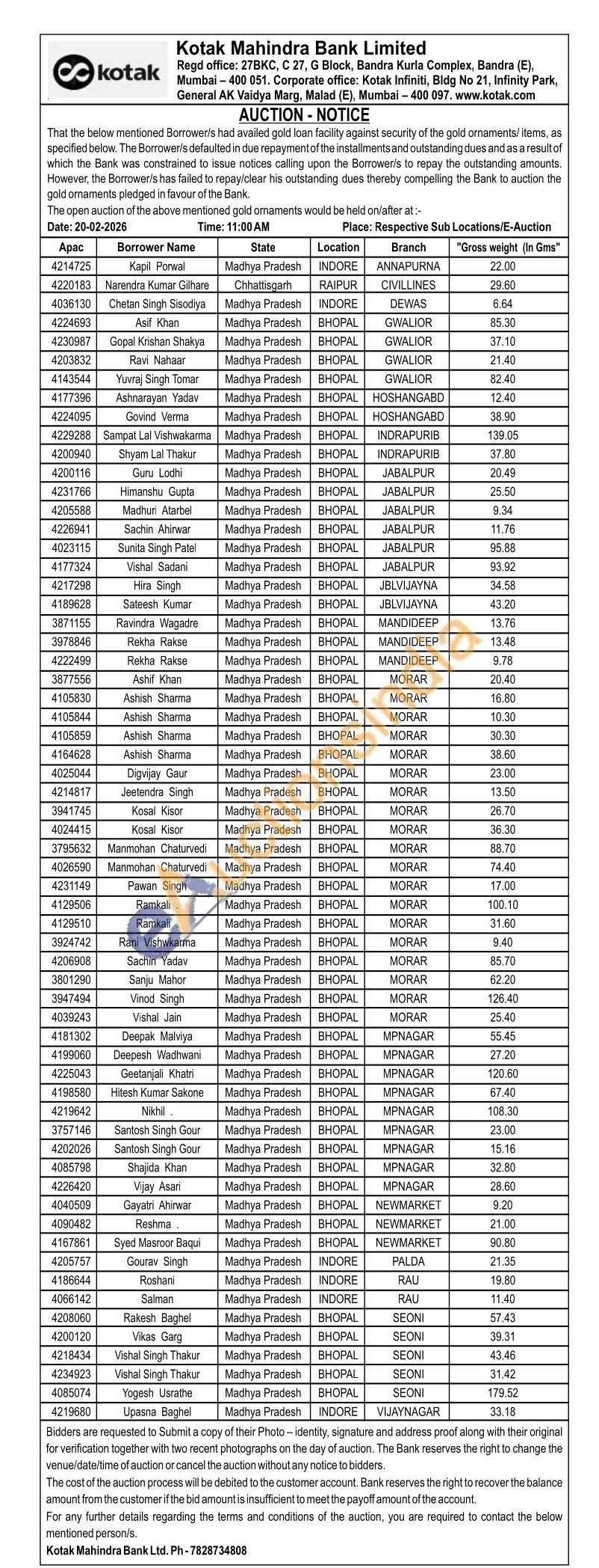 Kotak Mahindra Bank Gold Auctions Auction in Indore