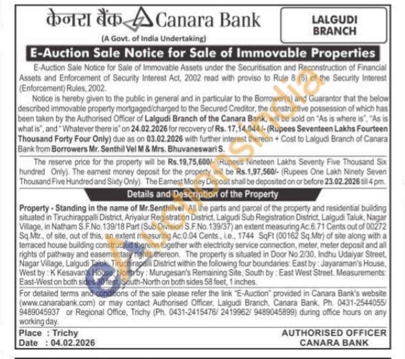 Property-Standing in the name of Mr.Senthilvel All the parts and parcel of the property and residential building situated in Tiruchirappalli District, Ariyalur Registration District, Lalgudi Sub Registration District, Laigudi Taluk, Nagar Village, in Natham S.F.No.139/18 Part (Sub Division S.F.No.139/37) an extent measuring Ac.6.71 Cents out of 00272 Sq.Mtr., of site, out of this, an extent measuring Ac 0.04 Cents, le., 1744 SqFt (00162 Sq. Mtr) of site along with a terraced house building constructed thereon together with electricity service connection, meter, meter deposit and all rights of pathway and easementary rights thereon. The property is situated in Door No 2/30, Indhu Udaiyar Street, Nagar Village, Laigudi Taluk, Tiruchirapalli District within the following four boundaries: East by: Jayaraman's House, West by: K Kesavan's House, North by: Murugesan's Remaining Site, South by: East West Street. Measurements: East-West on both sides 30 feet, South-North on both sides 58 feet, 1 inches.