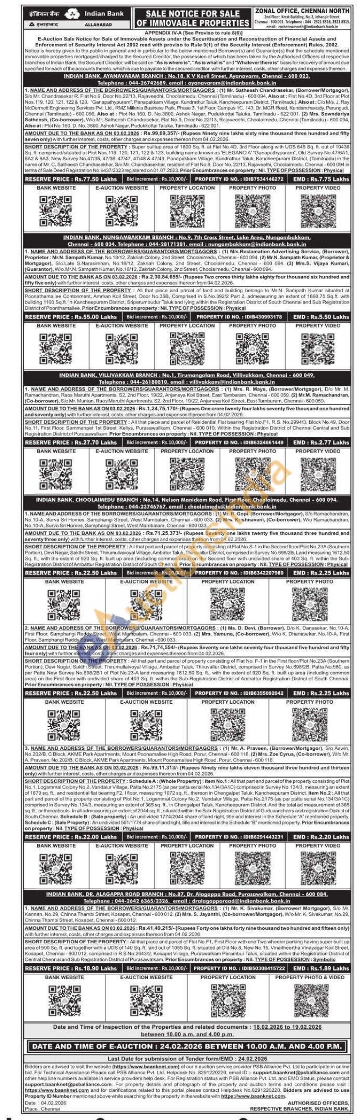 4) All that part and parcel of property consisting of Flat No.S-1 in the Second floor/Plot No.23A (Southerm Portion), Devi Nagar, Sakthi Street, Thirumullaivoyal Village, Ambatur Taluk, Thiruvallur District, comprised in Survey No.698/28, Land measuring 1612.50 Sq. ft., with the extent of 920 Sq. ft. built up area (including common area) on the Second floor with undivided share of 403 Sq. ft. within the Sub-Registration District of Ambattur Registration District of South Chennai. Prior Encumbrances on property: NII. TYPE OF POSSESSION