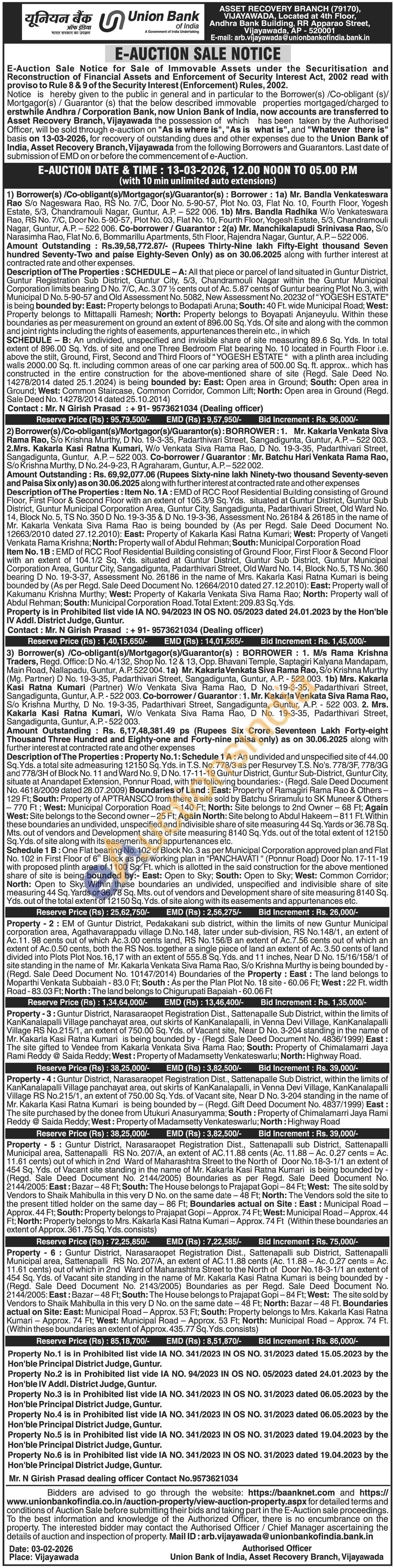 Description of The Properties: SCHEDULE-A: All that piece or parcel of land situated in Guntur District, Guntur Registration Sub District, Guntur City, 5/3, Chandramouli Nagar within the Guntur Municipal Corporation limits bearing D No. 7/C, Ac. 3.07 ½ cents out of Ac. 5.87 cents of Guntur bearing Plot No. 3, with Municipal D No. 5-90-57 and Old Assessment No. 5082, New Assessment No. 20232 of "YOGESH ESTATE" is being bounded by: East: Property belongs to Bodapati Aruna; South: 40 Ft. wide Municipal Road; West: Property belongs to Mittapalli Ramesh; North: Property belongs to Boyapati Anjaneyulu. Within these boundaries as per measurement on ground an extent of 896.00 Sq. Yds. Of site and along with the common and joint rights including the rights of easements, appurtenances therein etc., in which