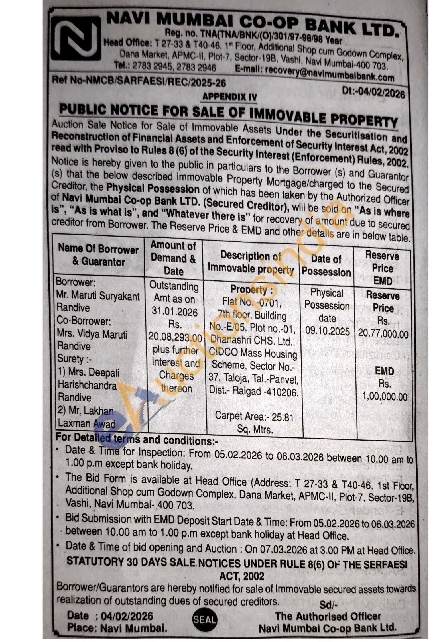 Flat No. -0701, 7th floor, Building No.-E/05, Plot no.-01, Dhanashri CHS. Ltd., CIDCO Mass Housing Scheme, Sector No.-37, Taloja, Tal.-Panvel, Dist.- Raigad -410206.Carpet Area:- 25.81 Sq. Mtrs