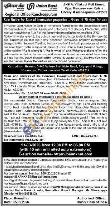 Description of immovable secured assets to be Sold; Thiruvannamalai District, Cheyyar Registration District, kannamangalam Sub District, Ami Taluk, Kiznahar Group, in Pudupalayam village. Land with Existing R.C.C. Roof Residential Building Ground Floor, First Floor Only Situate Palta no.1670. Item 1- Gramanatham survey No.20/3, (New No:320/4), situated on the east of the house of C. Sankar, West of the house of Krishnamoorthi, north of item no. Il set out hereunder, south of the street, amidst cast to west 11 feet, north to south 41 feet. Total Sq. ft 451. Item II-Punja survey No. 16/5B, Acre 0.11 out of acre 0.22 (4796 Sq. ft.) situated on the east of the Natesan land, west of the land of Balaraman, north of the land of Sankar, and south of the land of Savithiri ammal, (New sub division No. 16/582)